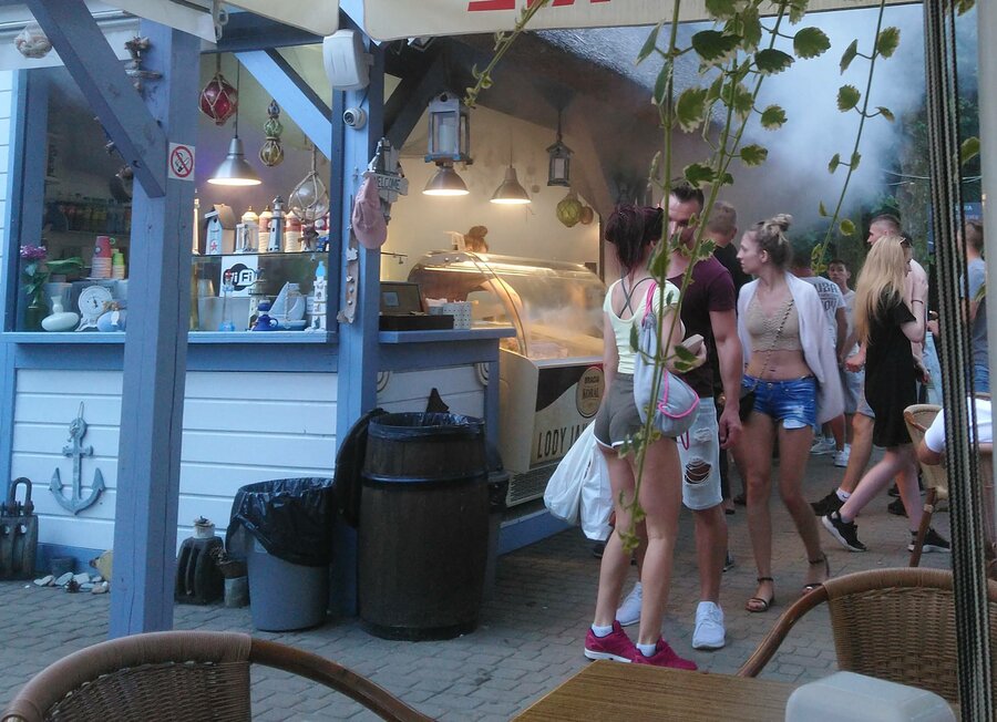 In Kolobrzeg wilden we uit eten. Milja komt in de stemming met een biertje.